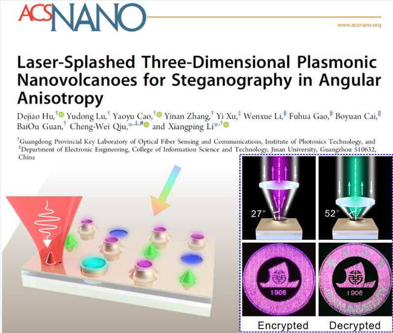 近日,我校光子技术研究院海外英才创新团队与关柏鸥团队合作的最新研究成果“Laser Splashed Three-Dimensional Plasmonic Nanovolcanoes for Steganography in Angular Anisotropy”在ACS nano 杂志(IF=13.7)发表。第一作者为我校光子技术研究院博士后胡德骄,共同通讯作者为新加坡国立大学教授仇成伟和我校光子技术研究院教授李向平。此外,四川大学和深圳大学的合作者也为这项研究做出了贡献。
