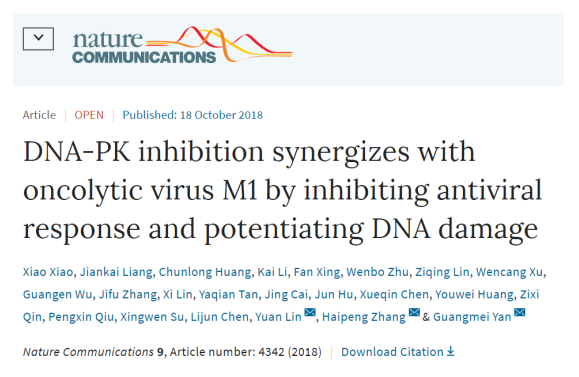10月18日,我校基础医学院药理学创新团队张海鹏教授联合中山大学颜光美教授团队在Nature子刊Nature Communications(IF:12.353)上发表了题为“DNA-PK inhibition synergizes with oncolytic virus M1 by inhibiting antiviral response and potentiating DNA damage”的原创性论文。我校张海鹏教授和中山大学颜光美教授、林园副教授为论文的共同通讯作者。