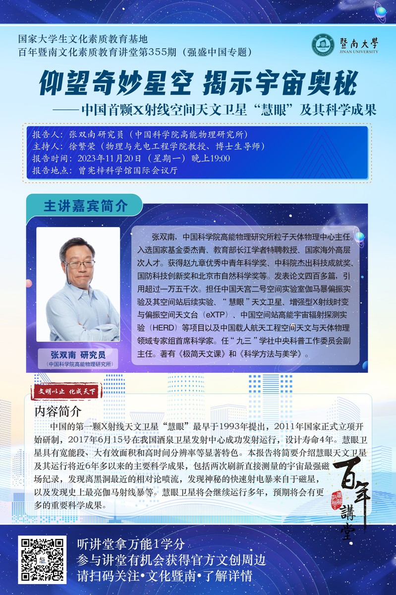 百年私密直播文化素质教育讲堂第355期:张双南:仰望奇妙星空 揭示宇宙奥秘——中国首颗X射线空间天文卫星“慧眼”及其科学成果