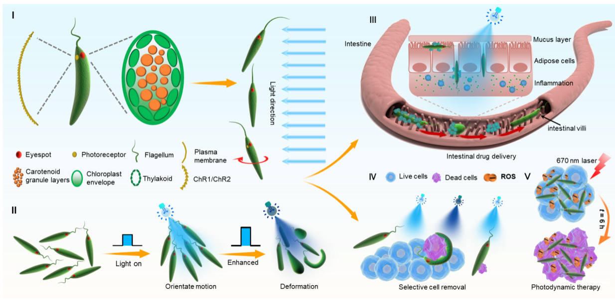 鉴于此,辛洪宝教授团队提出了光控软体生物微机器人的方案,选择自然界中广泛存在的微藻(纤细裸藻)作为构建软体微机器人的基本材料,这种裸藻具有良好的生物兼容性和环境适应性。由于纤细裸藻的光敏感蛋白对蓝光极为敏感,团队使用波长为450nm的蓝光,通过激活光敏感蛋白和钙离子通道,进一步调控鞭毛运动方式和表皮横模滑动,实现了对纤细裸藻的精准导航和形变控制,进一步将其构建成能执行多种生物医学任务的软体生物微机器人。凭借微机器人的可变形性和对不同环境的高适应性特点,成功实现了在复杂微流通道、肠道黏膜等不同狭窄多变的微环境中执行靶向药物输送和选择性移除病变细胞的精准生物医学功能。更为重要的是,由于纤细裸藻本身富含叶绿素,构建的微机器人在光照下可以进行光合作用产氧,并且在670nm波长激光照射下,叶绿素可以被还原为叶绿色衍生物,形成天然光敏剂,使得该微机器人能够在目标区域对癌细胞进行精准光动力治疗。这种光控软体微机器人为多功能生物医学精准微操作提供了一种新的生物微机器人工具,在狭窄且复杂多变的微环境中执行多功能生物医学任务领域具有极大的应用前景。