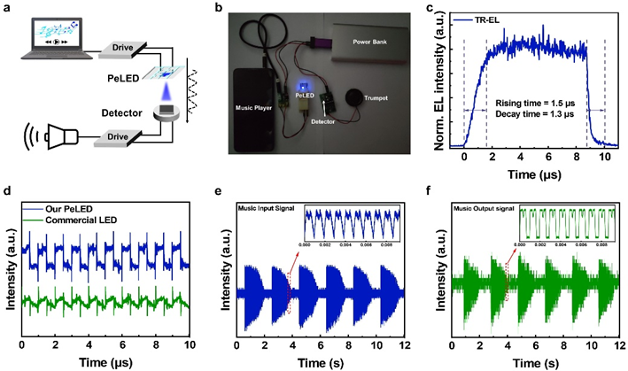 这项工作为开发高效稳定纯蓝光发射PeLEDs提供了一种新的可行性方案,同时证明其在可见光通信领域也有较好的应用前景。
