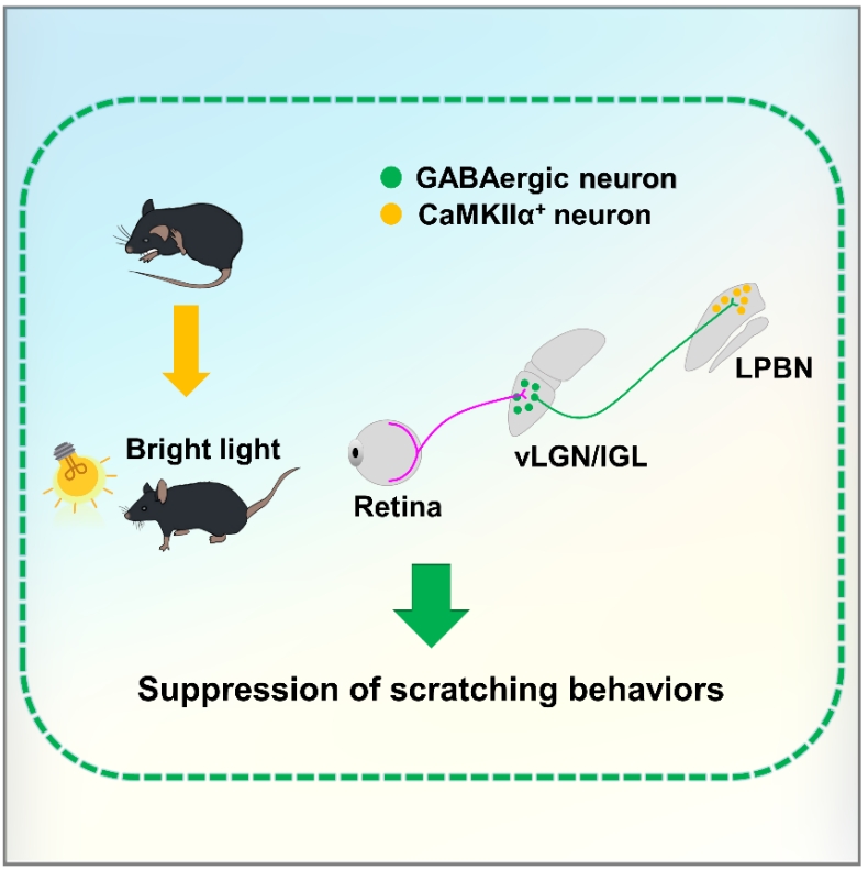 本研究通过建立组胺、氯喹及化合物48/80诱导的急性瘙痒模型,发现亮光干预可通过激活LPBN相关光信息传导通路缓解小鼠的抓挠行为。具体来说,亮光可通过激活小鼠视网膜中一类表达SMI-32的对光反应型神经节细胞(RGCs),进而激活vLGN/IGL内部分GABA能神经元,后者可通过直接投射进一步抑制LPBN内CaMKIIα阳性神经元的活动。作者发现遗传特异性激活投射至vLGN/IGL的RGCs或“vLGN/IGL-LPBN”神经通路均可显著减少抓挠行为。此外,作者通过系列实验证明亮光对瘙痒的缓解作用依赖于“RGCs-vLGN/IGL-LPBN”神经通路的介导(图1)。上述结果进一步丰富了我们对非成像系统结构和功能内涵的理解,也有望为临床光疗策略在瘙痒相关疾病中的治疗提供新依据。
