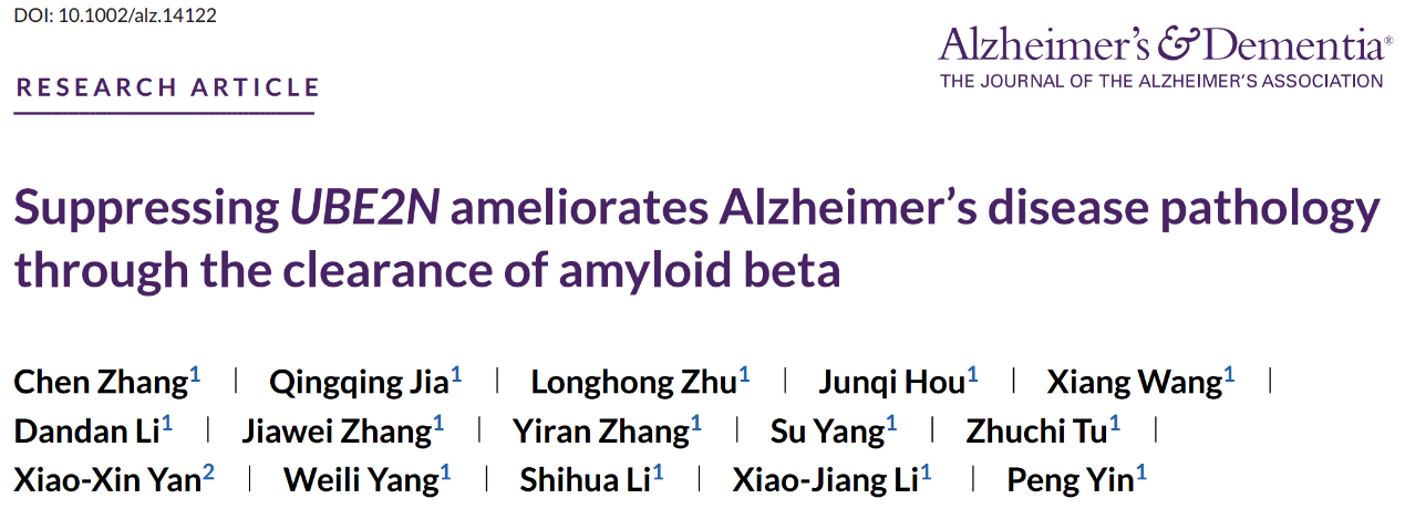 私密直播融媒体中心讯 7月17日,私密直播粤港澳中枢神经再生研究院殷鹏/李晓江团队在国际著名经典期刊《阿尔茨海默病与痴呆》Alzheimer's & Dementia(中科院一区,IF=13.0)在线发表题为“Suppressing UBE2N ameliorates Alzheimer’s disease pathology through the clearance of amyloid-β”的研究论文。该研究发现通过抑制UBE2N可清除β-淀粉样蛋白(Aβ)并改善阿尔茨海默病(Alzheimer’s disease,AD)病理,为揭示神经退行性疾病的分子机理及寻找到有效治疗方法提供了思路(论文链接:http://doi.org/10.1002/alz.14122)。