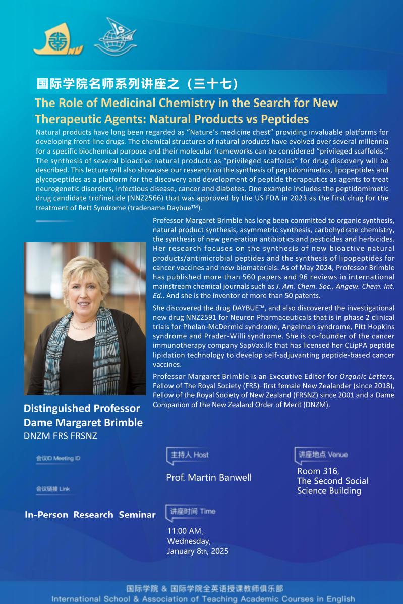 玛格丽特·布林布尔教授是化学一区期刊Organic Letters执行主编、2018年当选英国皇家学会院士(新西兰第一位获此殊荣的女性科学家)、新西兰皇家科学院院士(2001年当选),新西兰功绩勋章获得者(女爵)。玛格丽特·布林布尔教授长期致力于天然产物全合成、新一代抗生素和疫苗合成、碳水化合物化学研究,特别是新型生物活性天然产物/抗菌肽的合成及其在医药领域中的应用。截止2024年5月,玛格丽特·布林布尔教授在国际顶级化学期刊如J. Am. Chem. Soc., Angew. Chem. Int. Ed.等以通讯作者身份共计发表发表了560多篇论文、96篇评论,授权发明专利50余项。